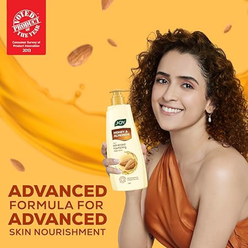 Experience the power of Joy Honey & Almonds Advanced Nourishing Body Lotion, enriched with Almond Oil, Honey, Vitamin E, and Aloe Vera for ultimate nourishment.