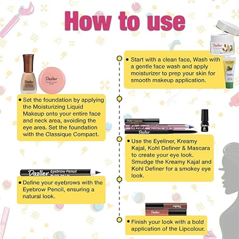 Mesmerizing Eye Magic: Illuminate your eyes with Dazller Kreamy Kajal's jet-black allure and experiment with captivating looks using Dazller Kohl Definer's striking blue hue and superb color payoff. Craft intricate designs with Dazller Eyeliner's fine brush for eyes that enchant and enhance your lashes with the water-resistant Dazller Mascara while framing your eyebrows with the Dazller Eyebrow Pencil.