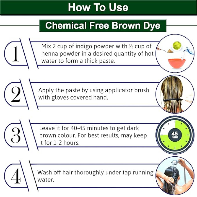 Directions: ✅ For Black tones, use 100% henna first and then second step of indigo at 100% (two step). . ✅ For reddish brown, use a 75% henna and 25% indigo mix. . ✅ For brown tones, use a 50% indigo and 50% henna mix. . ✅ For dark brown tones, use a 75% indigo and 25% henna mix.