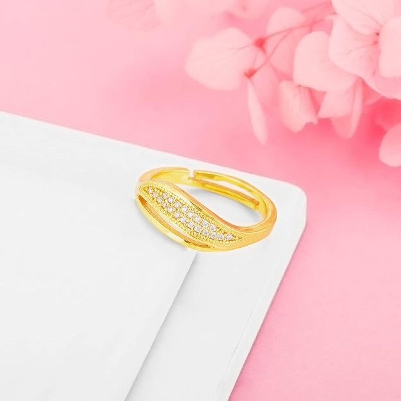 - This golden ring has a layered wave design with one layer studded with zircon.