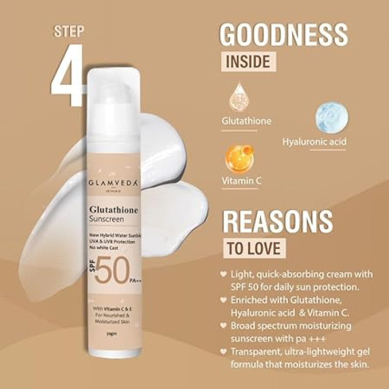Glamveda Glutathione 4-Step Skincare Routine For Healthy & Radiant Skin | Skin Brightening and Lightening Combo ( Facewash + Facecream + Faceserum + Sunscreen )