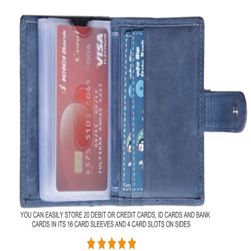 Husk N Hoof RFID Protected Leather Credit Card Holder Wallet for Man Women | Card Holder for Men Woman | Blue (20 Card Slots)