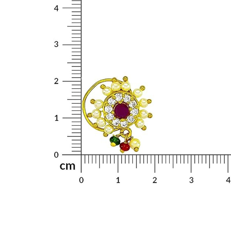 JEWELOPIA Maharashtrian Nath CZ Nose pin Traditional Bridal Nath Wedding Jewellery Marathi AD Nose Stud non piercing Pearl Gold Plated Clip On Press Nath Nose Ring For Girls