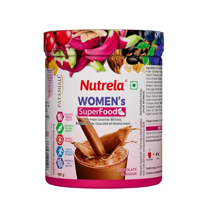 Nutrela Women Superfoods Protein Powder - 400g, Chocolate | Everyday Fitness with Biofermented Multivitamins & Whey Protein to support in Bone & Joints Health , Muscle , Heart , Hair & Nails , Vitality and Mood Stabilizer
