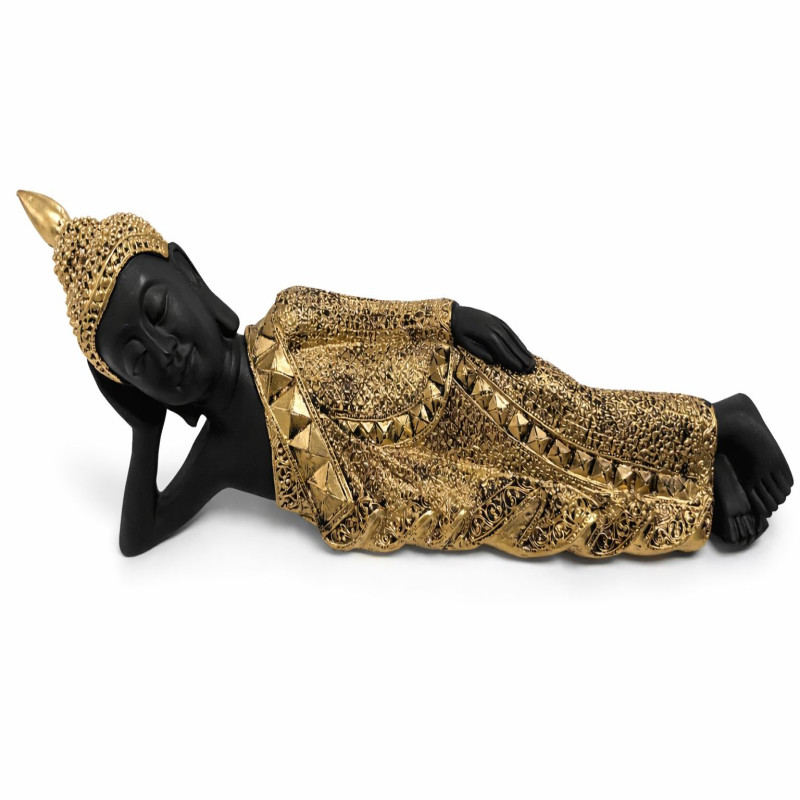 Perfect for living rooms, bedrooms, meditation corners, office desks, or pooja spaces, this decorative piece blends effortlessly with both modern and traditional interiors. The rich antique gold highlights against the deep black base give it a luxurious and premium look, making it an eye-catching centerpiece wherever placed. Whether you are looking to enhance your own space or searching for a thoughtful gift for housewarmings, weddings, festivals, or special occasions, this reclining Buddha statue serves as a symbol of positivity, tranquility, and refined taste. Crafted with durable materials and attention to detail, it is not just a décor item but a statement of calmness and spiritual elegance.