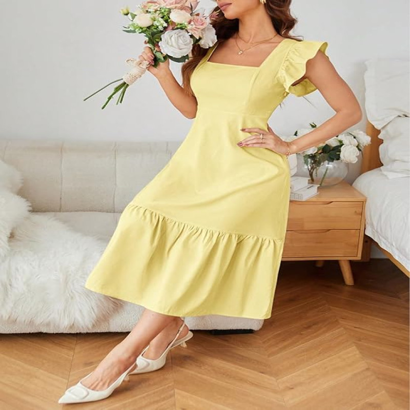 - DESIGN: Elegant midi dress featuring a sophisticated square neckline, ruffle-trimmed cap sleeves, and a cinched waist for a flattering silhouette