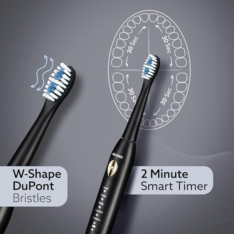 AGARO COSMIC LITE Sonic Electric Tooth Brush For Adults With 5 Modes, 2 Brush Heads & Rechargeable With 4 Hours Charge Lasting Up To 25 Days, Power Toothbrush, (Black)