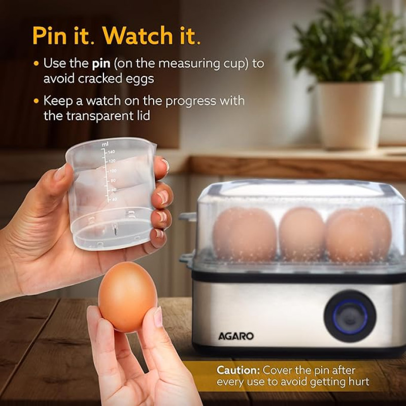 AGARO Grand Egg Boiler And Poacher, 2-in1 Boils 8 Eggs, Poach 4 Eggs, Steamed Vegetables, 3 Boiling Types, Stainless Steel Body, Transparent Lid, 500W, Silver