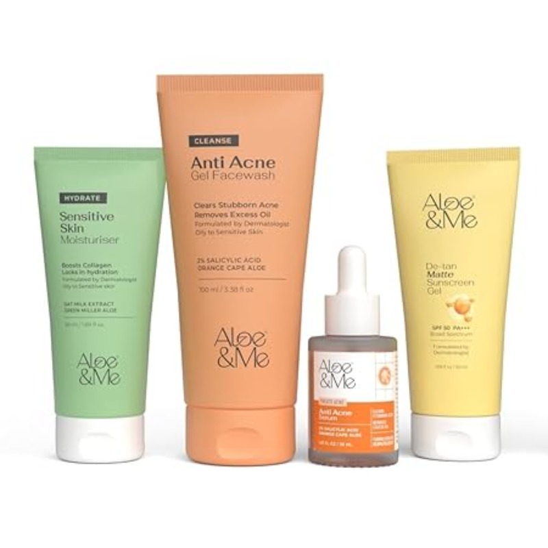 Aloe&ME 4 Step Anti Acne Kit | Facewash, De-Tan Matte Sunscreen Gel, Moisturizer, Serum | for All Skin Types | Men and Women