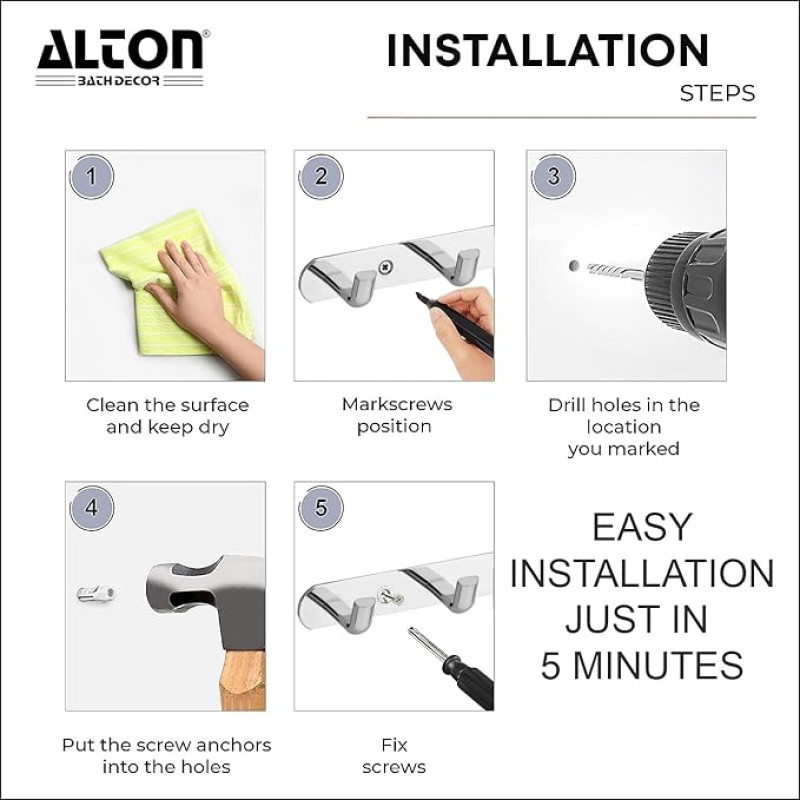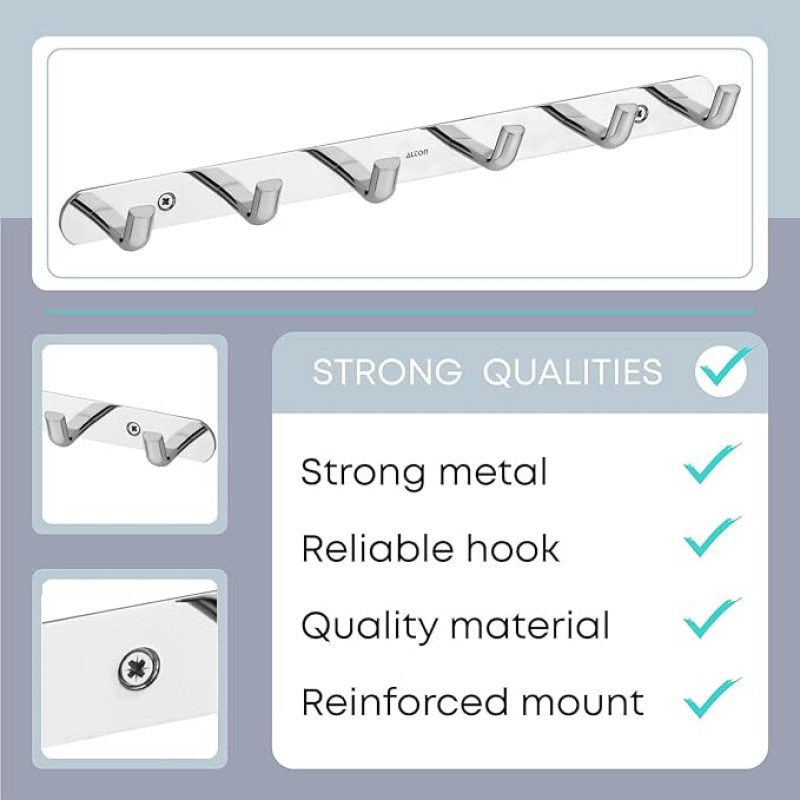 ALTON ALD965, Stainless Steel, 6-Pin Wall Hooks for Hanging Cloth and Towel Hangers for Wall Hooks, Door Hangers, Hook Rail, Silver