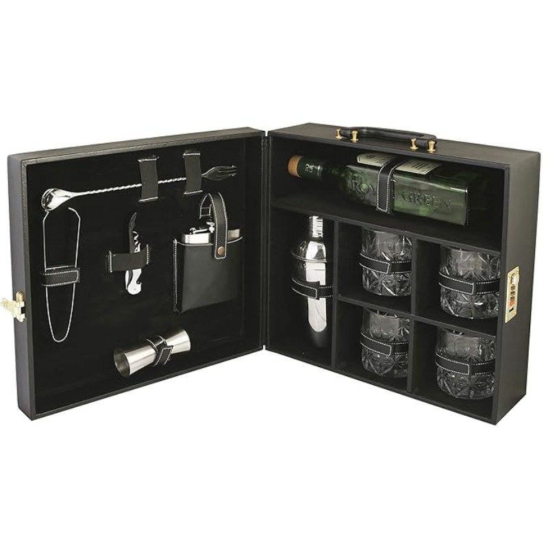 Anything & Everything Portable Bar Set | Portable Leatherette Bar Set | Wine Case | Whisky Case | Portable Bar Accessories Set (Holds 01 Bottle & 04 Whisky Glasses) (Black & Black)