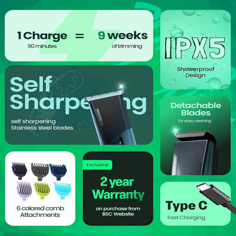 Bombay Shaving Company Power Play NXT Trimmer, 9 Weeks of trimming, 90 mins run time with Type C, 6 comb attachments, Self sharpening blades | Trimmer for Men