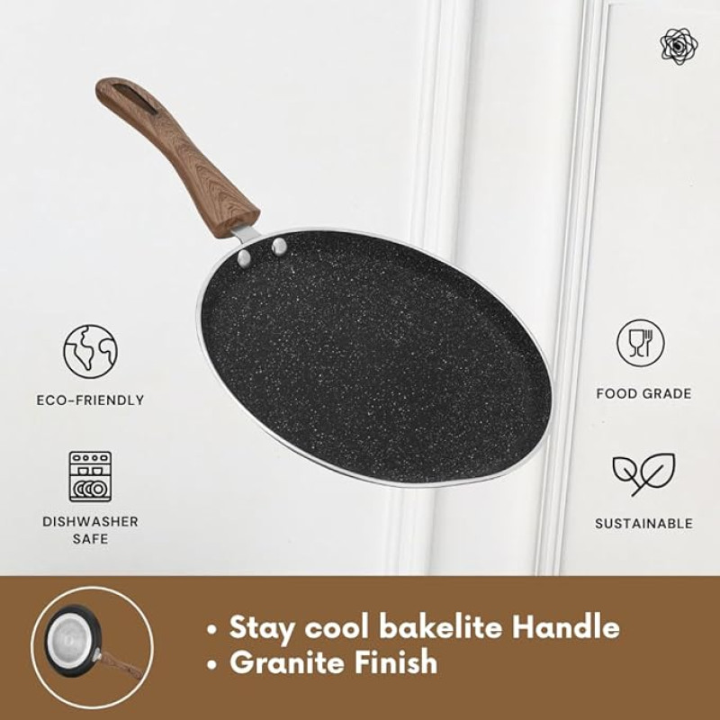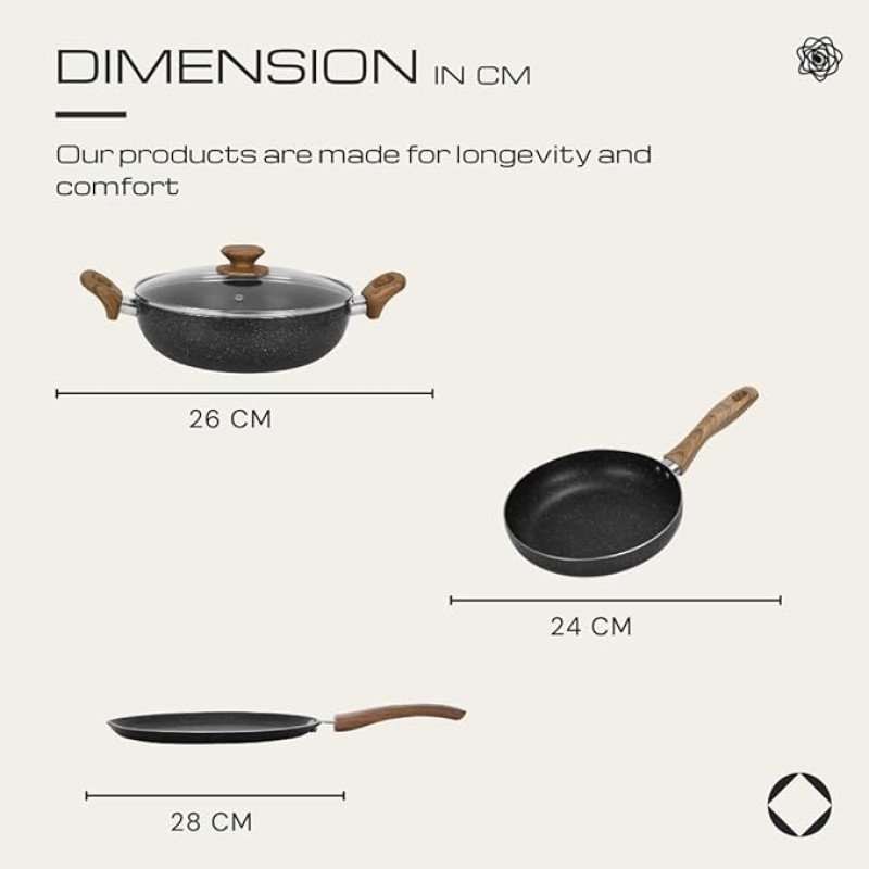 Chakmak Gravel Non Stick Granite 4 Pcs Cookware Set | Frypan 24cm 1500ml, Dosa Tawa 28cm, Kadhai with Glass Lid 26cm 3200ml | Gas & Induction Compatible, Granite Finish (4Pcs)