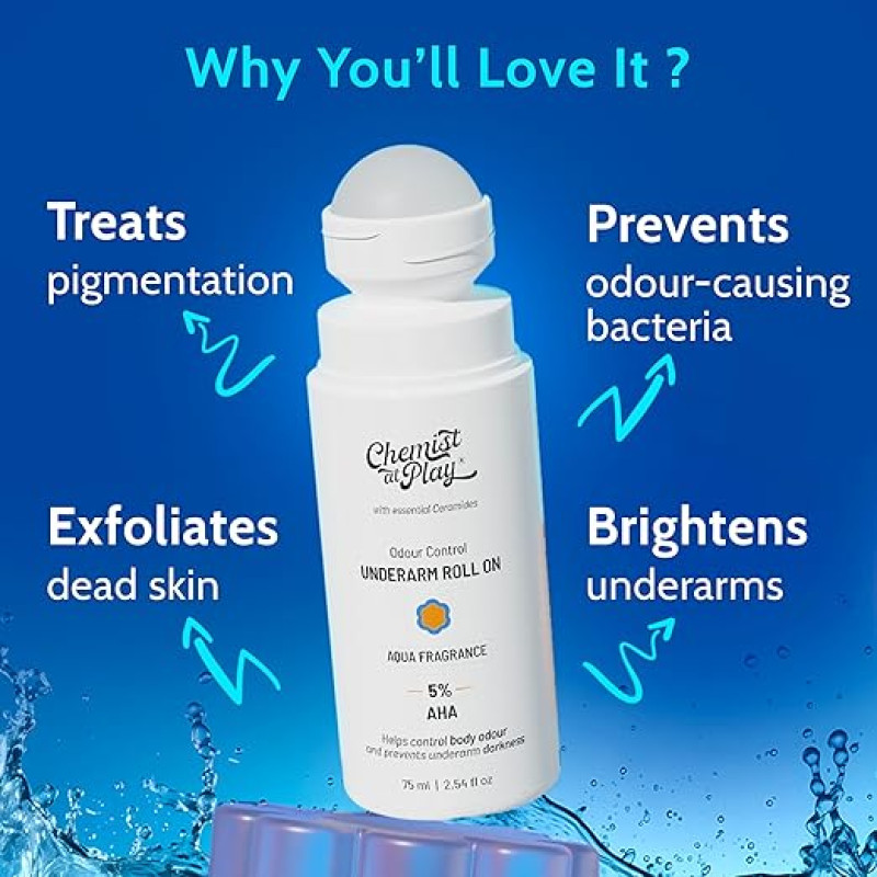 Chemist at Play UnderArm Roll-On with 5% AHA, Lactic Acid & 1% Mandelic Acid | Prevents Body Odour, Brightens Skin & Exfoliates Underarm | For Sensitive Skin | Aqua Fragrance | Alcohol Free - 75ml