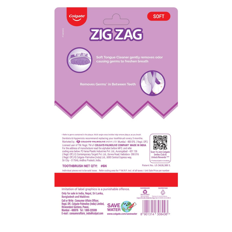 Colgate ZigZag Manual Toothbrush for adults, Pack of 6 Medium Multicolour Soft Tooth brush, Antibacterial with Compact Brush Head for Deep & Complete Cleansing