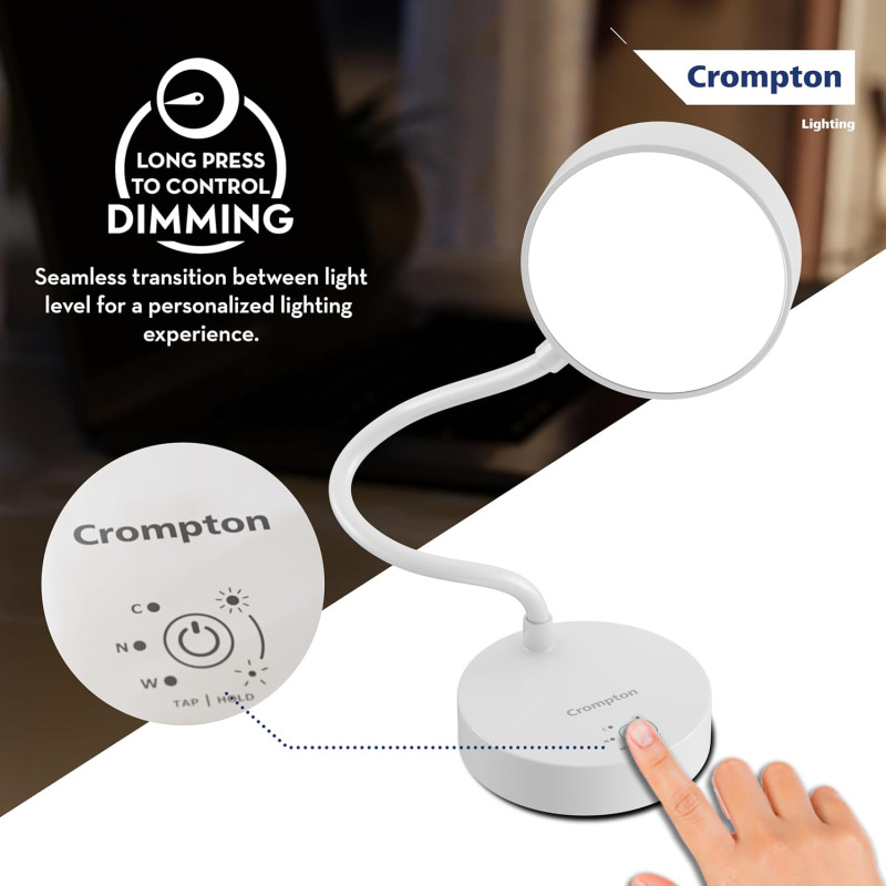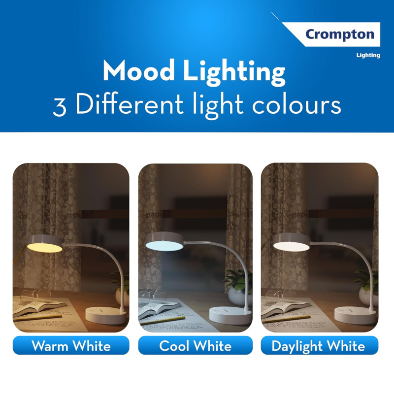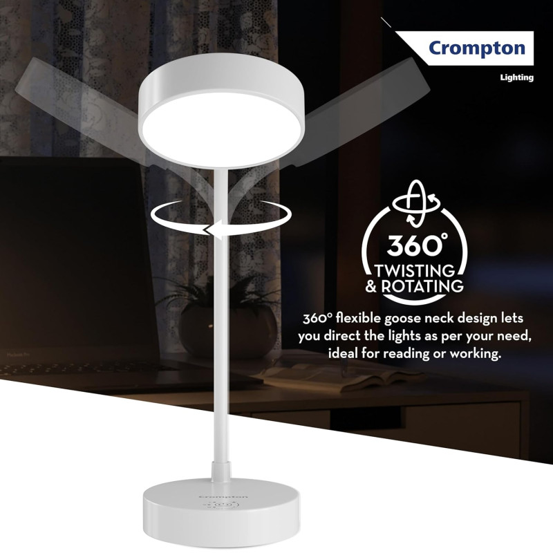 Crompton Plastic Led Deskmate|Table Lamp|Desk Light|5W|Sleek & USB Rechargable|Colour Changing|Smooth Dimming|Flexible & Adjustable Neck|Flame Safe Technology|Pack of 1,White