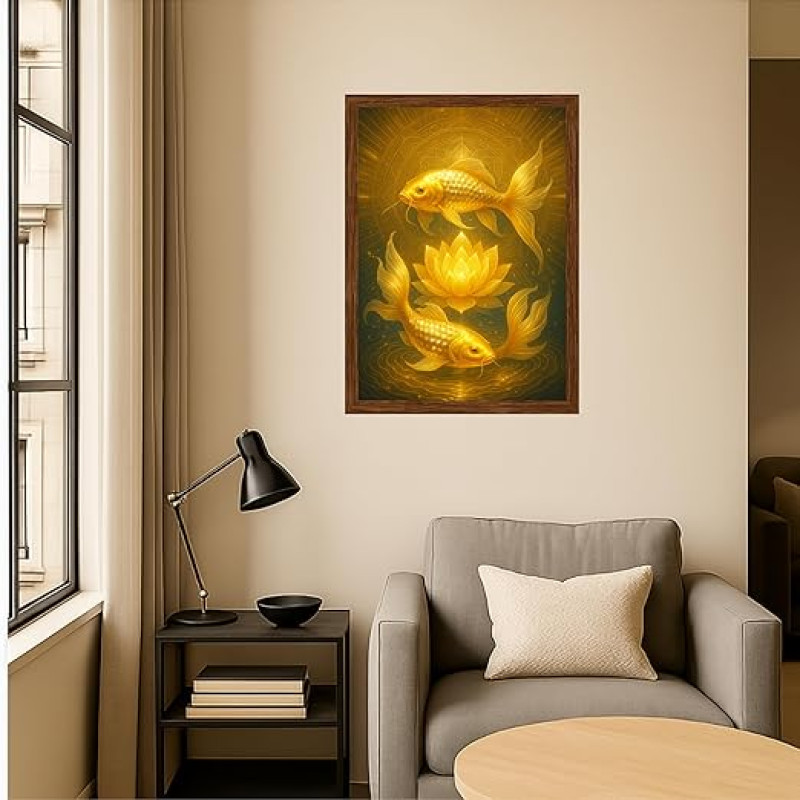 DIVARTH Golden Vastu Fish Wall Painting – Two Koi Fish Feng Shui Art for Positive Energy – Home Temple Office Decor Frame for Wall A4 Photo 10x13 Inch (Brown)