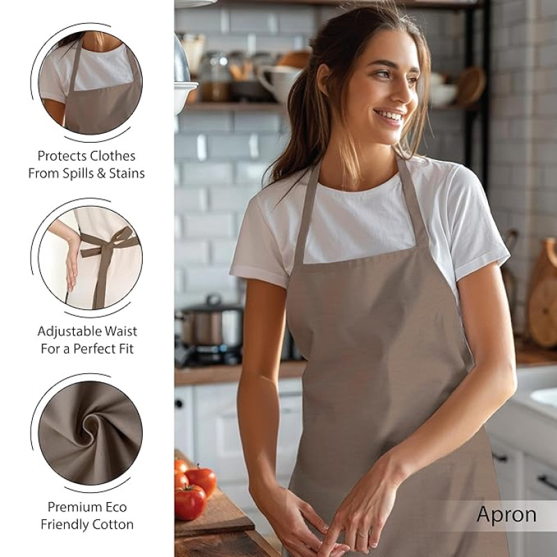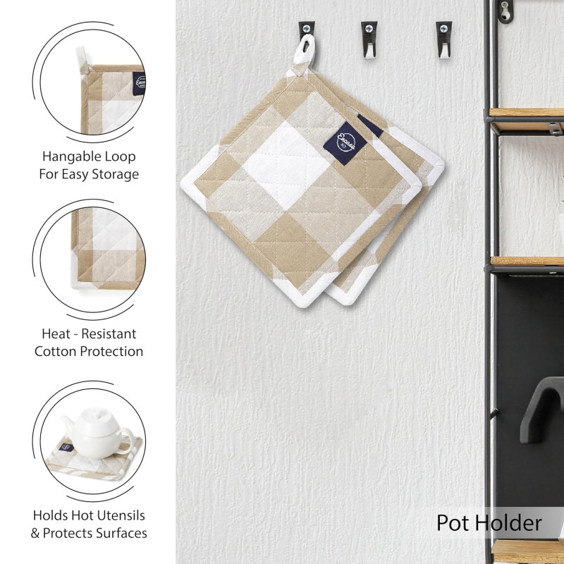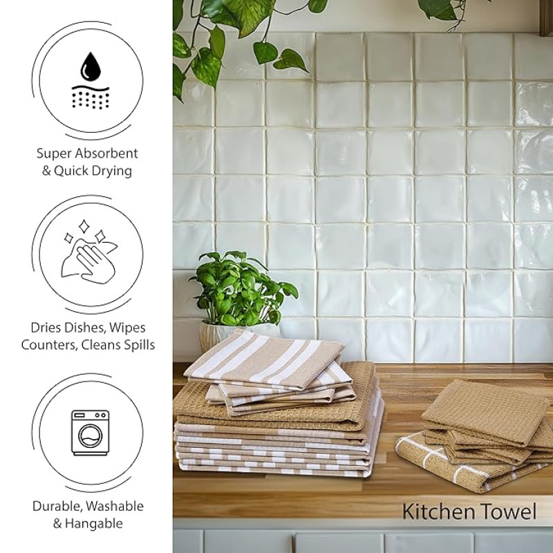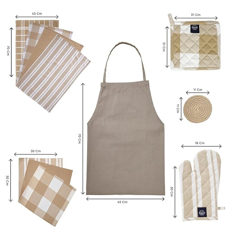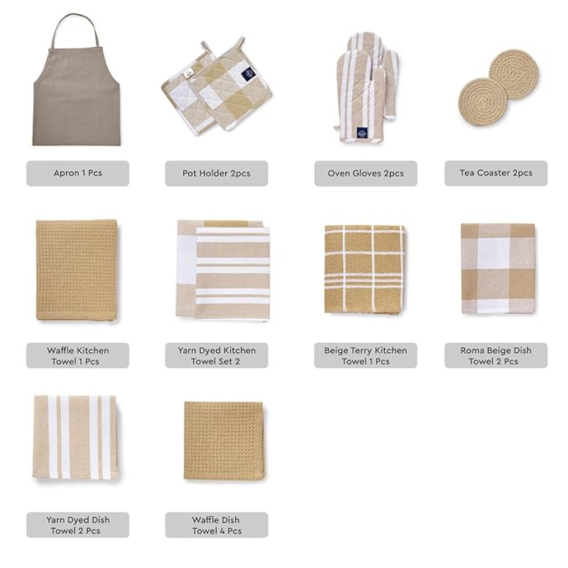 Encasa XO Kitchen Towels and Dishcloths Sets |21 Pcs Apartment Essentials Set | Oven Mitts and Pot Holders with Hanging Loop | Cooking Apron, Dish Cloth, Flour Sack and Coasters Beige Combo