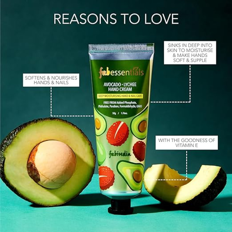 Fabessentials Avocado Lychee Hand Cream - 50gm | Vitamin E Handcream Deep Moistursing Hand & Nail Care | Moisturises & makes Hands Soft & Supple | Hand Cream for Women & Men | Hand Moisturizer | Hand Cream for Dry and Rough Hands