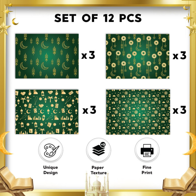 Festiko® Set of 12 Pcs Wrapping Papers for Ramadan/Eid (Green & Golden), Gift Wrapping Paper, Eid Party Supplies