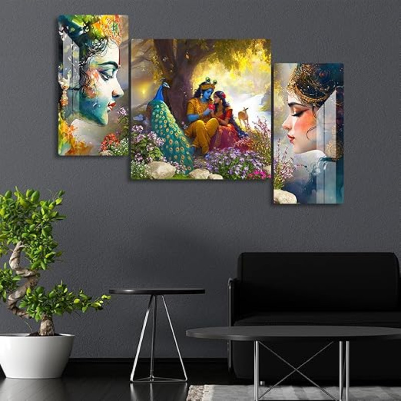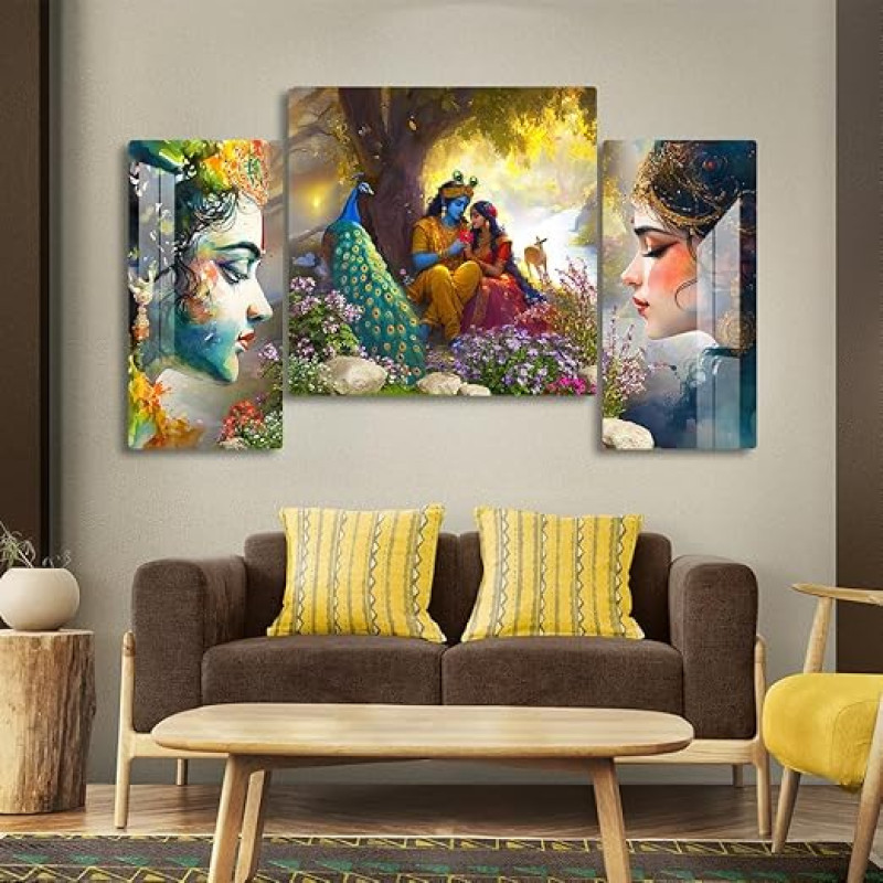 FIVE KRAFT Radha Krishna Wall Painting Set of 3 – Wall Art with Peacock & Nature for Home Decor Living Room, Bedroom & Pooja Room | 32x16 Inches