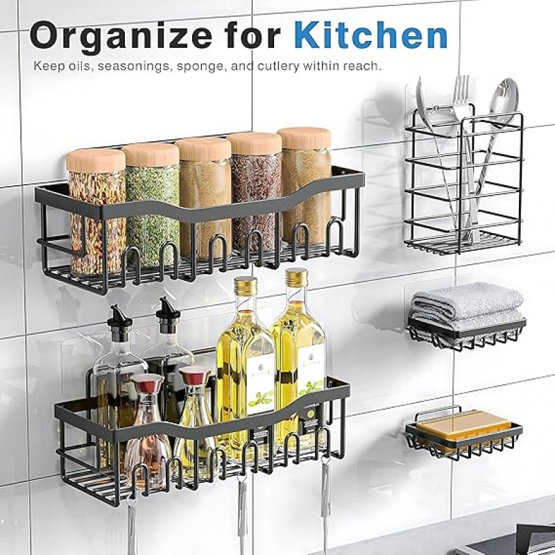FLYNEX 5 in 1 Self Adhesive Bathroom Shelf Rack & Wall Shelves | Bathroom Organiser Without Drill with Self-Adhesive Magic Stickers | Bathroom Accessories Set with Soap Dish & Toothbrush Holder
