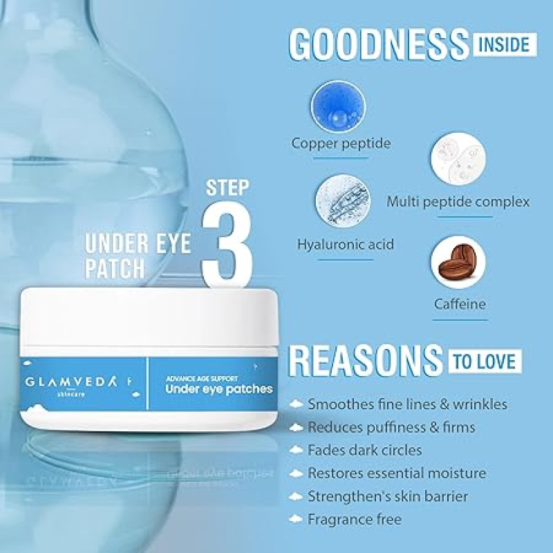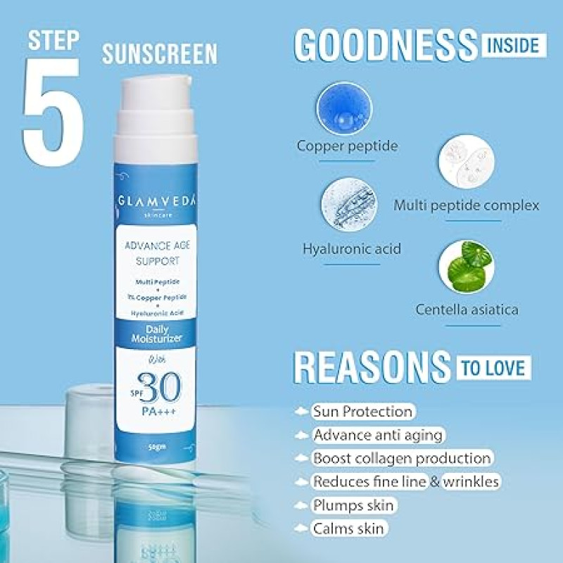 Glamveda 1% Copper Peptide & Hyaluronic Acid 5 Step Skincare Routine for Dull and Ageing Skin | Reduces Fine Lines & Wrinkles | Face Wash, Face Cream, Serum, Sunscreen, Under-Eye Patch