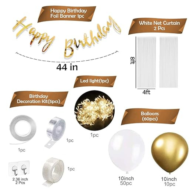- HAPPY BIRTHDAY DECORATION KIT INCLUDES : 1pc happy birthday golden foil banner, 50pcs white metallic balloon (10-inch), 10pcs golden metallic balloons (10-inch), 2pcs white net curtains, 2pcs hanger, 1pc ribbon for birthday, 1pc balloon arch, 1pc glue dot roll. This white and gold birthday decor looks very pretty in girls bday decorating.