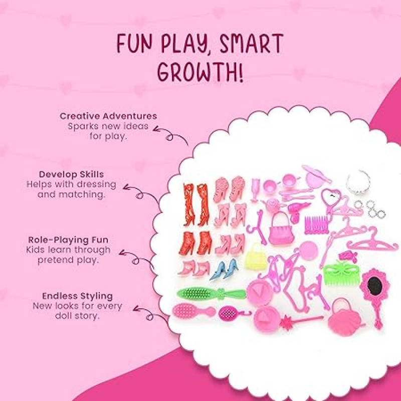 iDream Doll Accessories Set - 10 Cotton Doll Dresses & 50 Stylish Accessories for Imaginative Play - Perfect for Kids' Doll Wardrobes and Creative Adventures, Great Gift for Girls