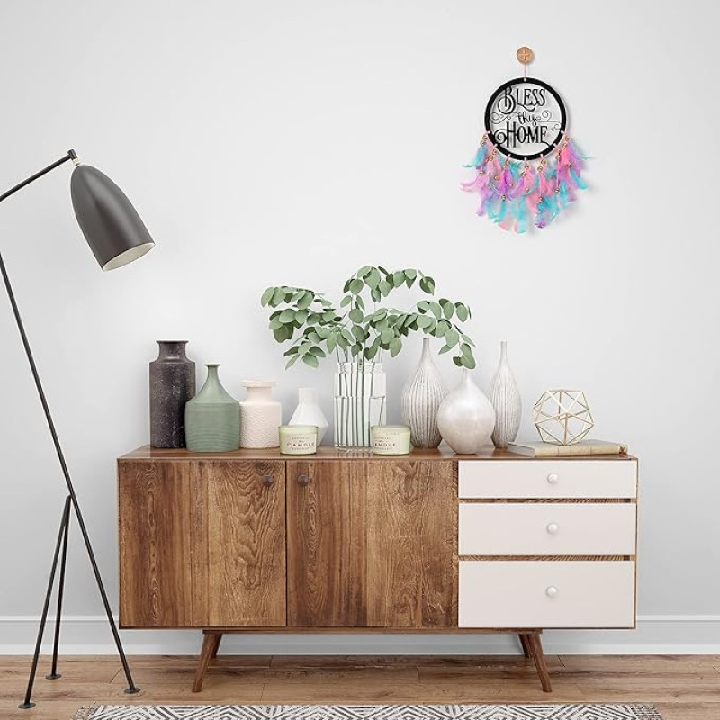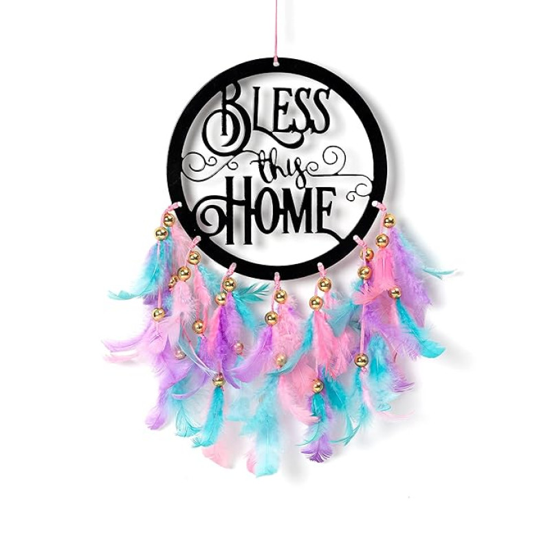 ILU Metal Dream Catcher Bless This Home, Wall Hangings, Nursery, Crafts, Home Décor, Office, Handmade For Bedroom, Balcony, Garden, Party, Café, Decoration, Wedding, Decorative, Pastel Multi Feathers