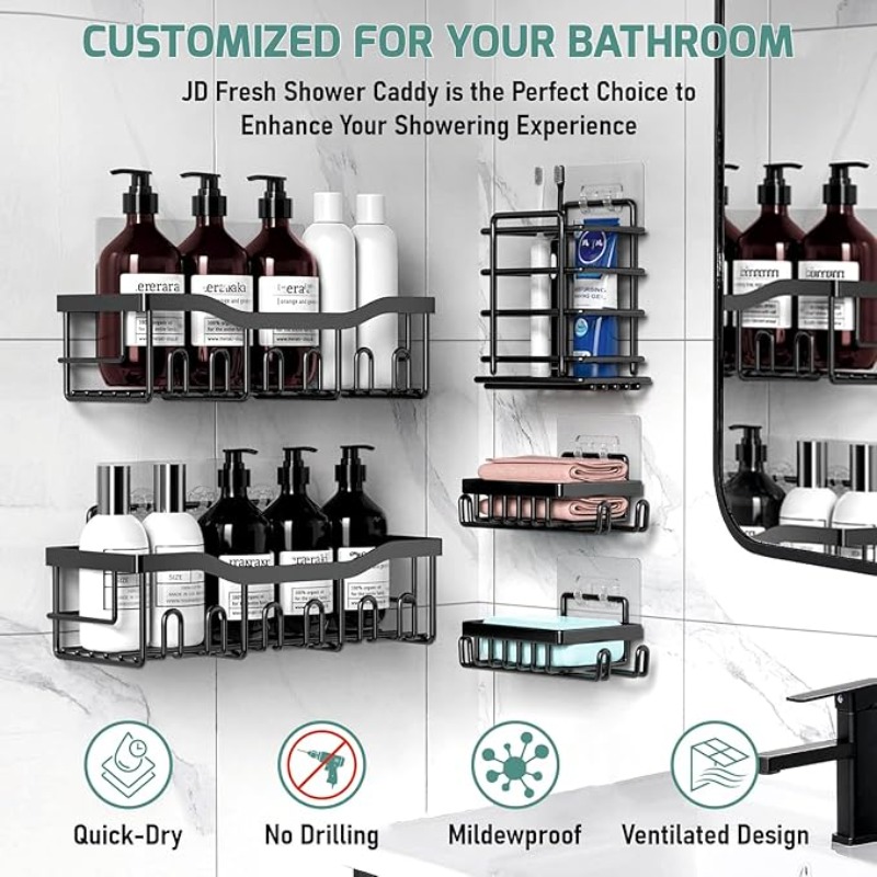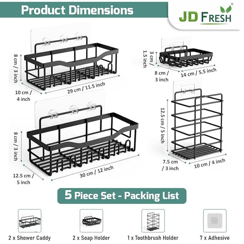 JD FRESH 5 in 1 Self Adhesive Shelf Organizer Combo/Metal Racks and Shelves for Wall/Stand for Bathroom Without Drill/Soap Holder with Tooth Brush Holder/Bathroom Accessories(Black)