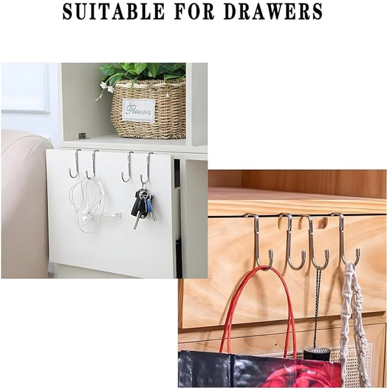 JIALTO Over The Door Drawer Cabinet Hook, S.S 304 Stainless Steel Double S-Shaped Hook Holder Hanger Metal Heavy Duty Free Punching Door Back Hanging Clothes Hook Organizer,Drawer (1, Silvers)