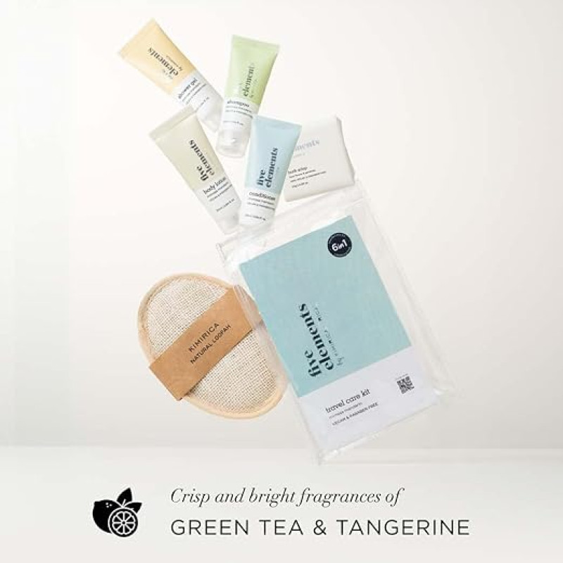 Kimirica Travel Kit Bath set Five Elements Luxury Bath and Body Care Travel Pouch Loofah| 6 in 1 self-care travel kit with a reusable pouch 100% Vegan |