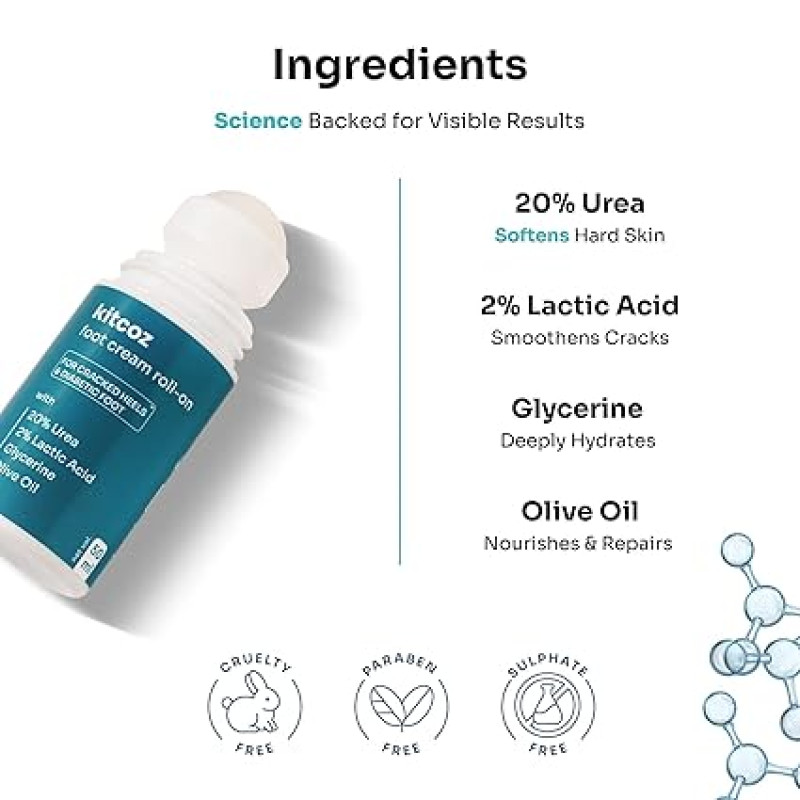 Kitcoz Foot Cream Roll On with 20% Urea, 2% Lactic Acid, Glycerine & Olive Oil for Dry Feet, Cracked Heels & Diabetic Foot | Non Sticky Formulation - 50ml