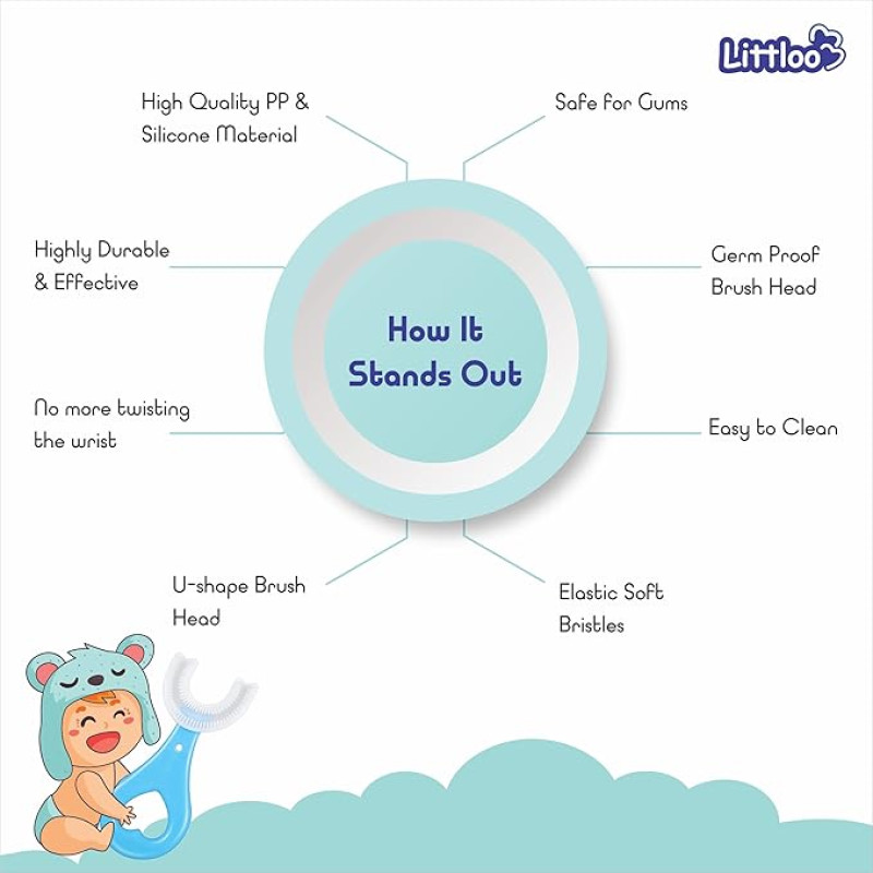 LITTLOO Baby U -Shaped Silicone Manual Tooth Brush With Soft & Elastic Bristles For Complete 360 Degree Dental Cleaning, Specially Designed For Toddlers & Children - (Pink)