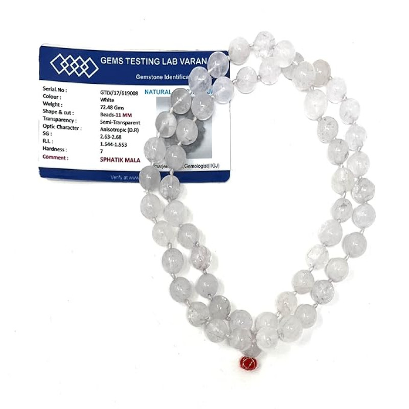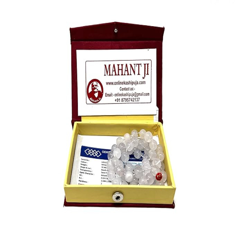 MAHANT JI 100% Pure and Certified 54 + 1 Beads Sphatik Or Crystal Mala with Lab Certificate, Gangajal and Chandan from Kashi (Weight Between 55 Gm to 70 Gm, Sphatik Mala Beads Size 9 MM to 11 MM)