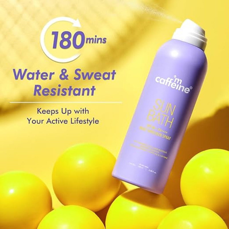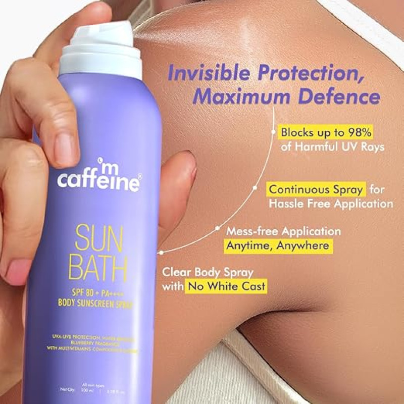 mCaffeine Sun Bath SPF 80+ PA ++++ Body Sunscreen Spray | High UV Protection | Invisible, Non-Greasy, 180 Mins Water/Sweat Resistant Cooling Spray| For All Skin Types | Blueberry Fragrance -100ml