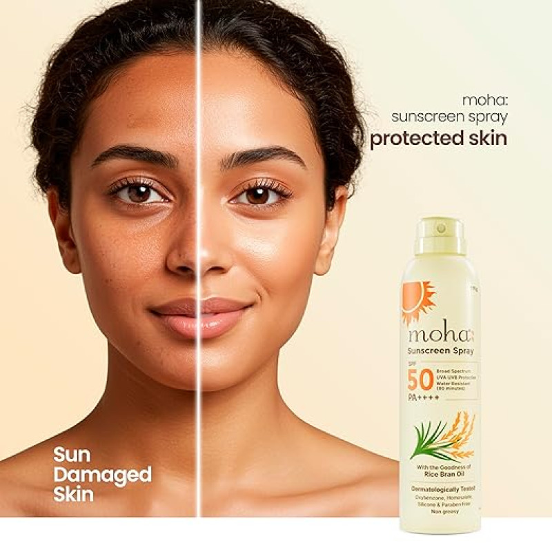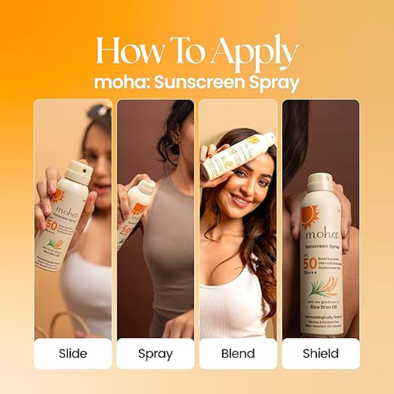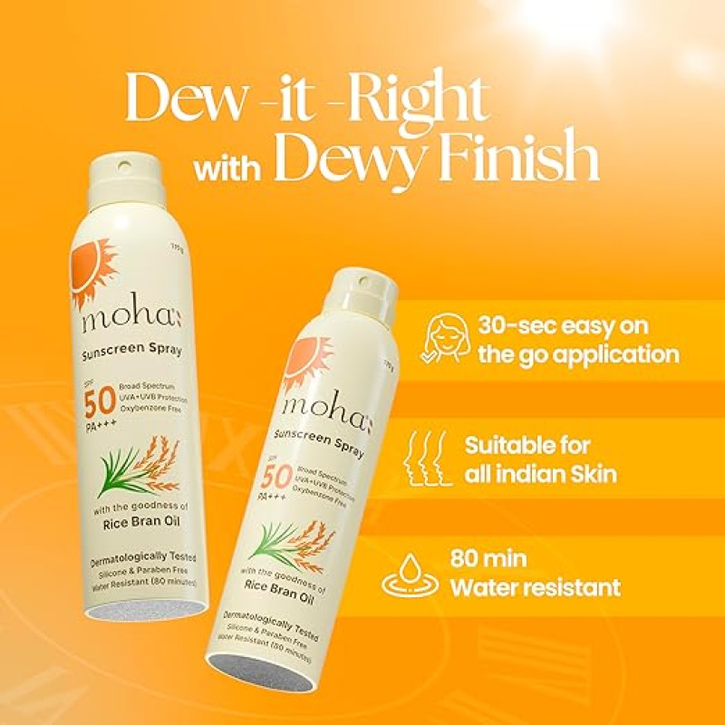 Moha Sunscreen Spray SPF 50 PA++++ | Lightweight & Non-Sticky SPF Spray for Face & Body | Quick-Absorbing, Waterproof & No White Cast | With Rice Bran Oil to Nourish & Protect Skin - 170g