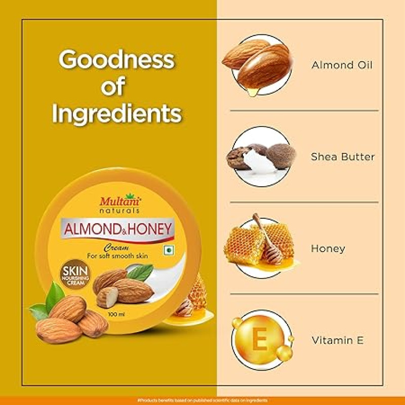 Multani Naturals Almond & Honey Cream | Deep Nourishing Hands & Body | Skin Cream with Natural Sunscreen For Glowing Skin | Protects for Dryness & Retains Natural Moisture 100 Ml