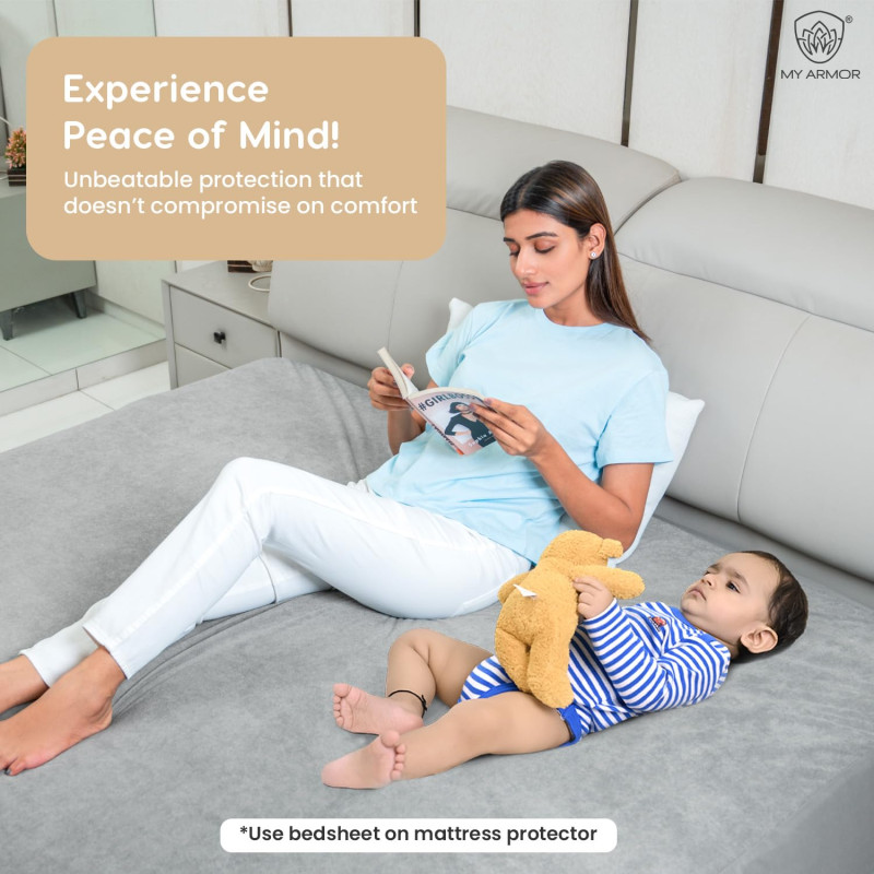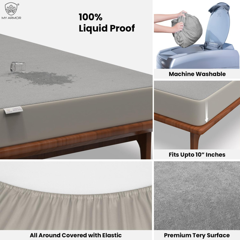 MY ARMOR Waterproof Mattress Protector King Size, 78x72, 6.5x6 feet, Double Bed Protector Sheet Cover, Breathable and Hypoallergenic Ultra Soft Fitted Terry Cotton Feel Fabric, Elastic Skirting, Grey