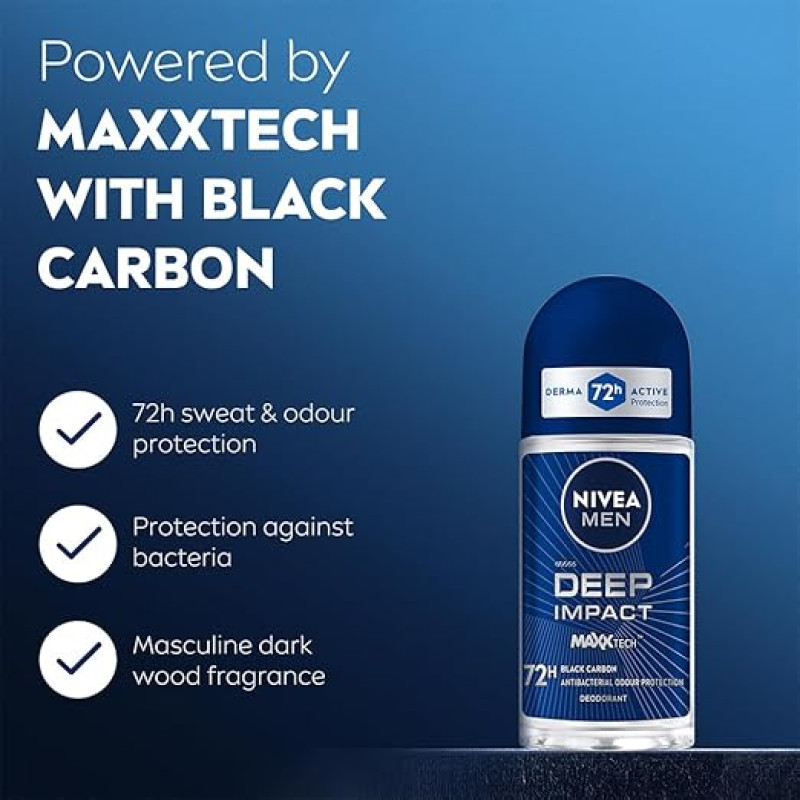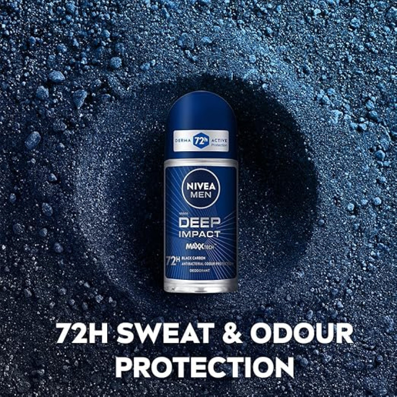 NIVEA MEN Deep Impact Freshness Deodorant Underarm Roll-on | 72 H Long Lasting Freshness | Infused with Black Carbon to fight bacteria and body odour | Woody masculine fragrance | 0% Alcohol | Dermatologically Approved & Paraben Free Formula | 50ml