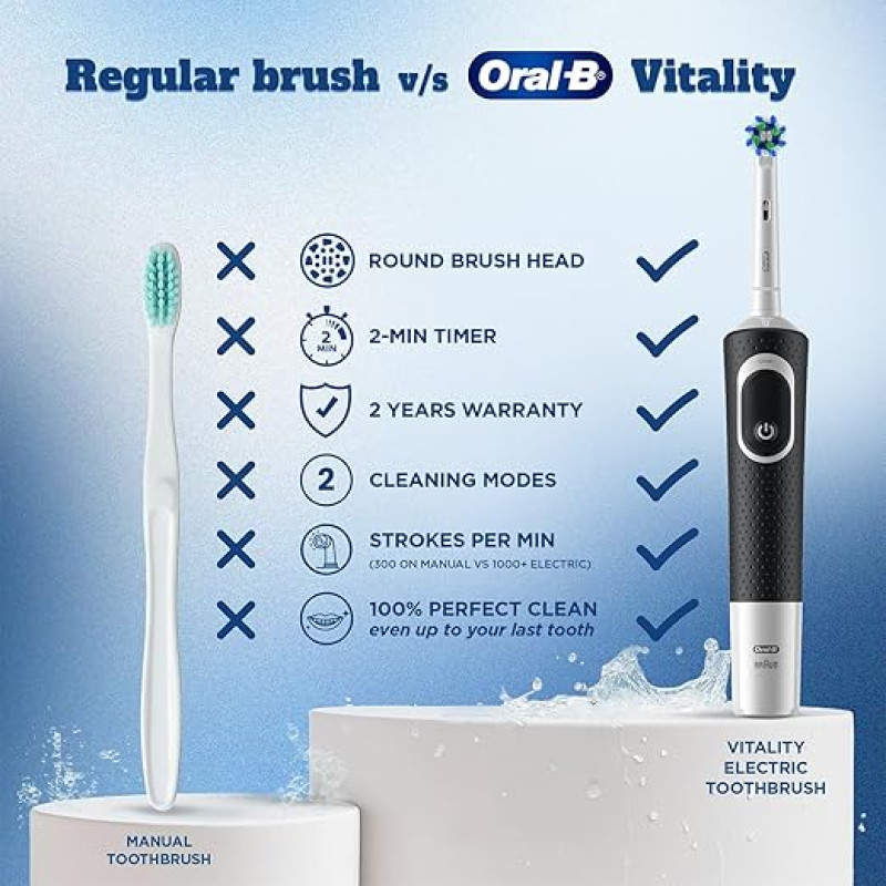 Oral B Vitality Rechargeable Rotating Electric Toothbrush for Adults, 2 Brushing Modes (Daily & Sensitive), 2 Min Timer with Quadpacer, 2 Year Warranty, IPX7 Water Resistant, Round Brush Head, (Black, 1)
