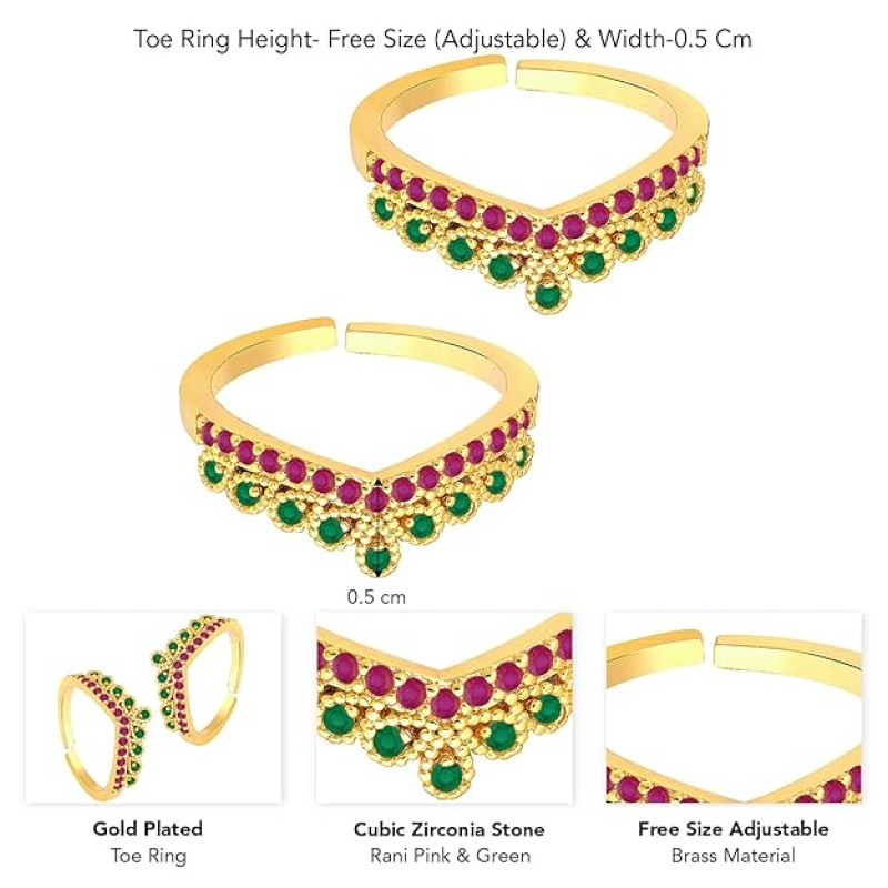 Peora Rani Pink Green Cubic Zirconia Studded Fancy Toe Ring Adjustable Gold Plated Bichiya Fashion Jewellery