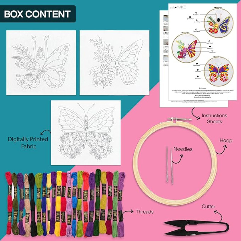 picknMAKE Cross Stitch Embroidery Kit Combo Pack for Beginners & Adults - Includes 3 Unique Designs, Hoop, Printed Fabric, Threads, Needles, Cutter, and Instructions -Craft Hobby, Multicolor
