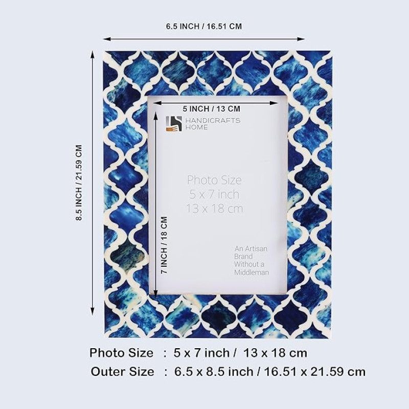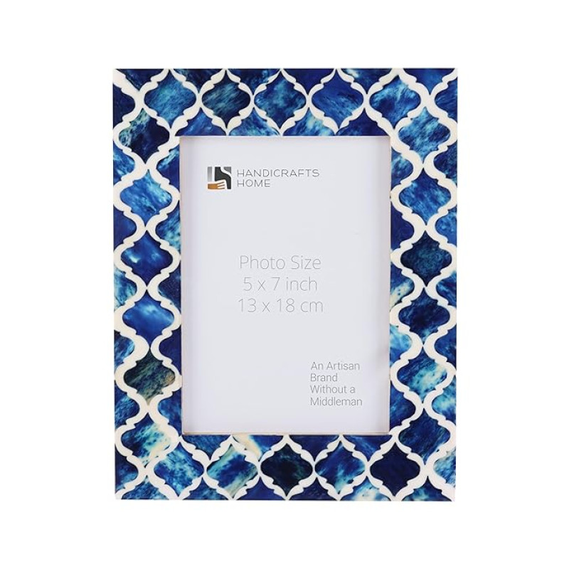 Picture Photo Frame Moorish Damask Moroccan Arts Inspired Handmade Naturals Bone Frames Photo Size 5X7 Inches Blue White