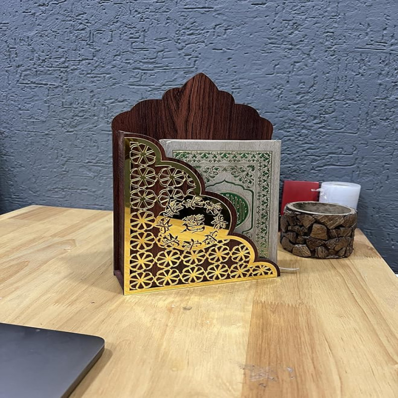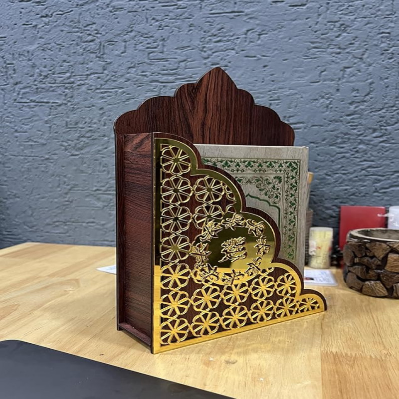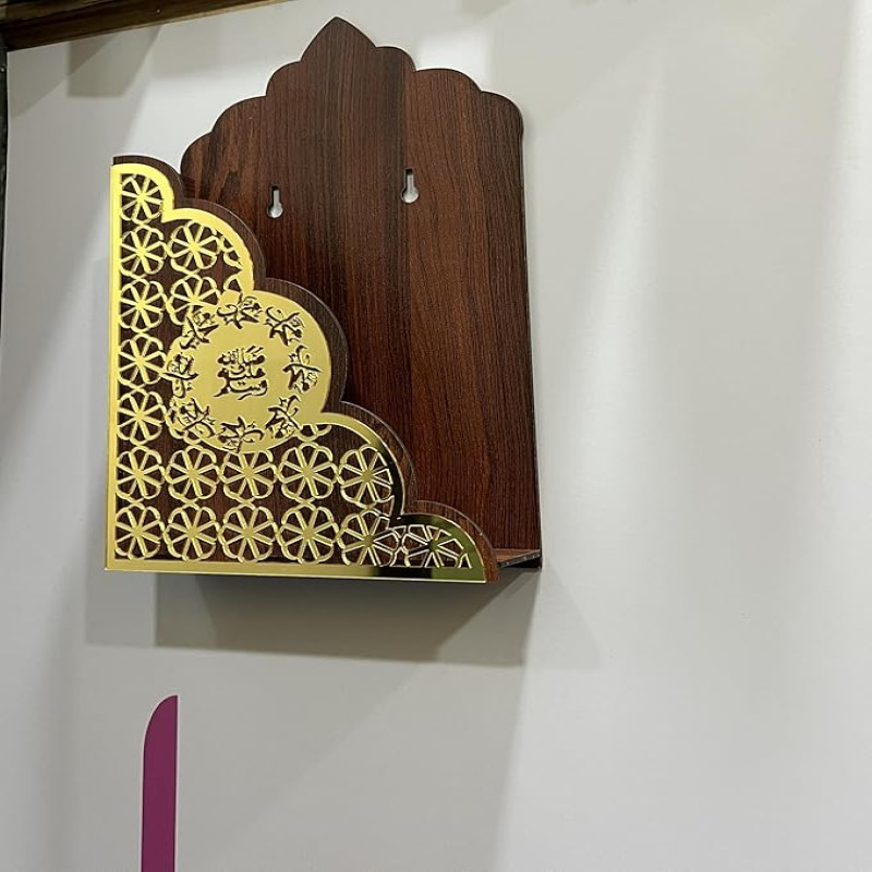 Quraan Holder Wall Mount, Quran Stand for Home | Islamic Book Holder | Brown & Gold Design | Durable & Stylish Quran Display Rack | Wooden