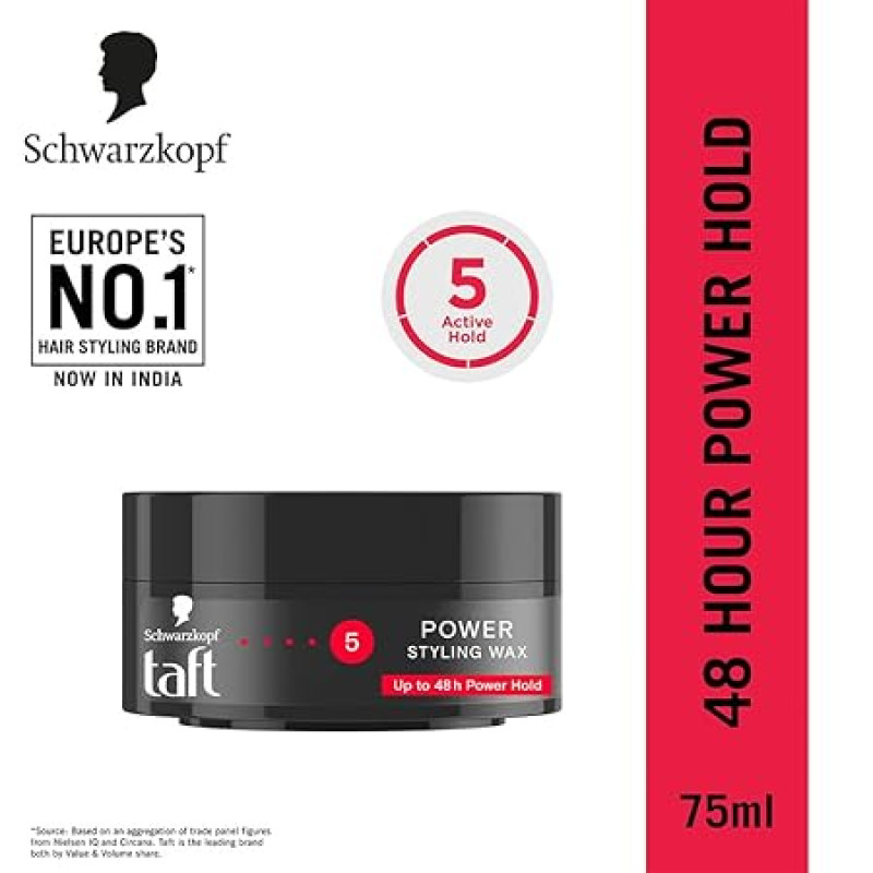 Schwarzkopf TAFT Power Hair Wax For Luminous Shine And Glossy Hair, Hold 5 Lasts 48 Hours, Easy to Wash Out With No Stickiness, For All Hair Types, No Greasy Residue - 75ML