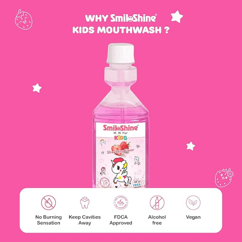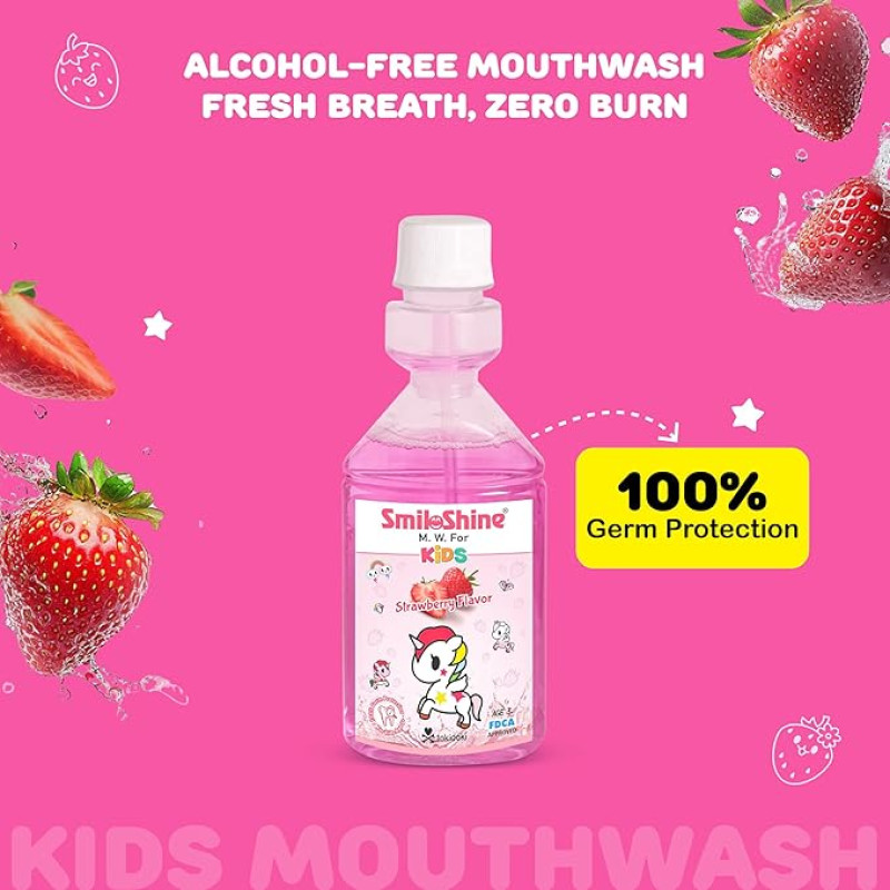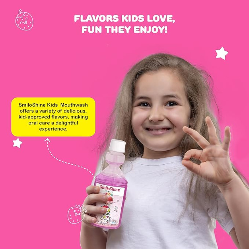 SmiloShine Kids Mouthwash – Juicy Orange/Lemon Lime/Strawberry (180ml) (150, Strawberry Flavour)
