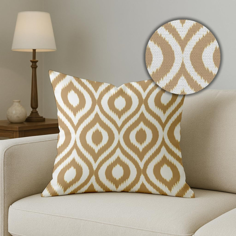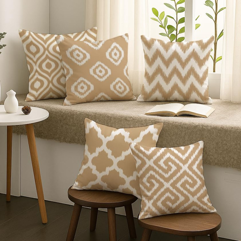STITCHNEST Set of 5 Polycotton Cushion Covers – 16x16 Inches – Beige & White Ikat Geometric Print – Elegant Cushion Covers for Sofa & Living Room Decor