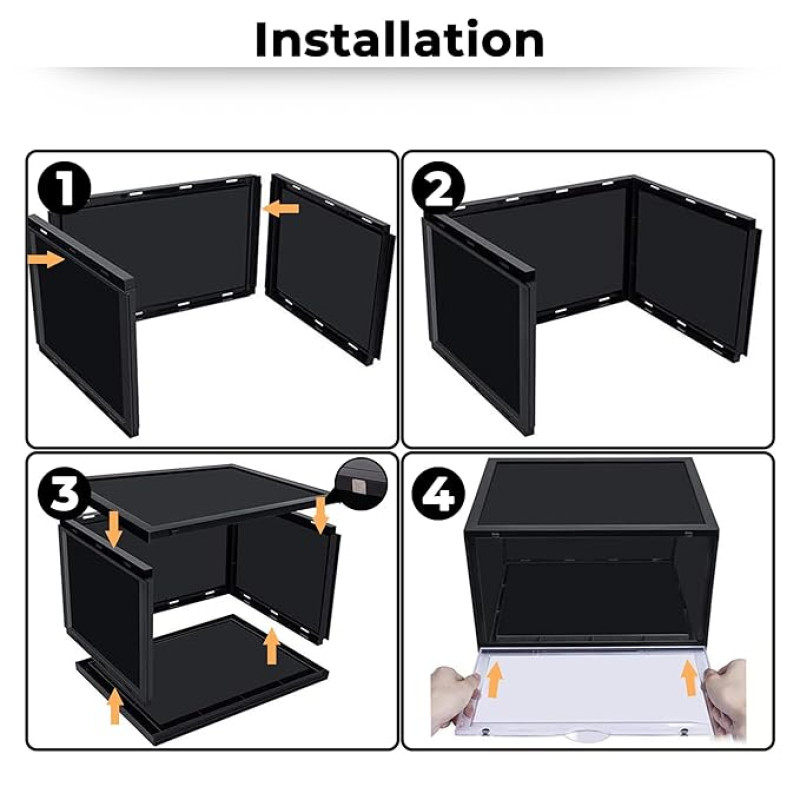Great product ! Easy to assemble, easy to see shoes through, easy to open and close. I highly recommend these shoe boxes.